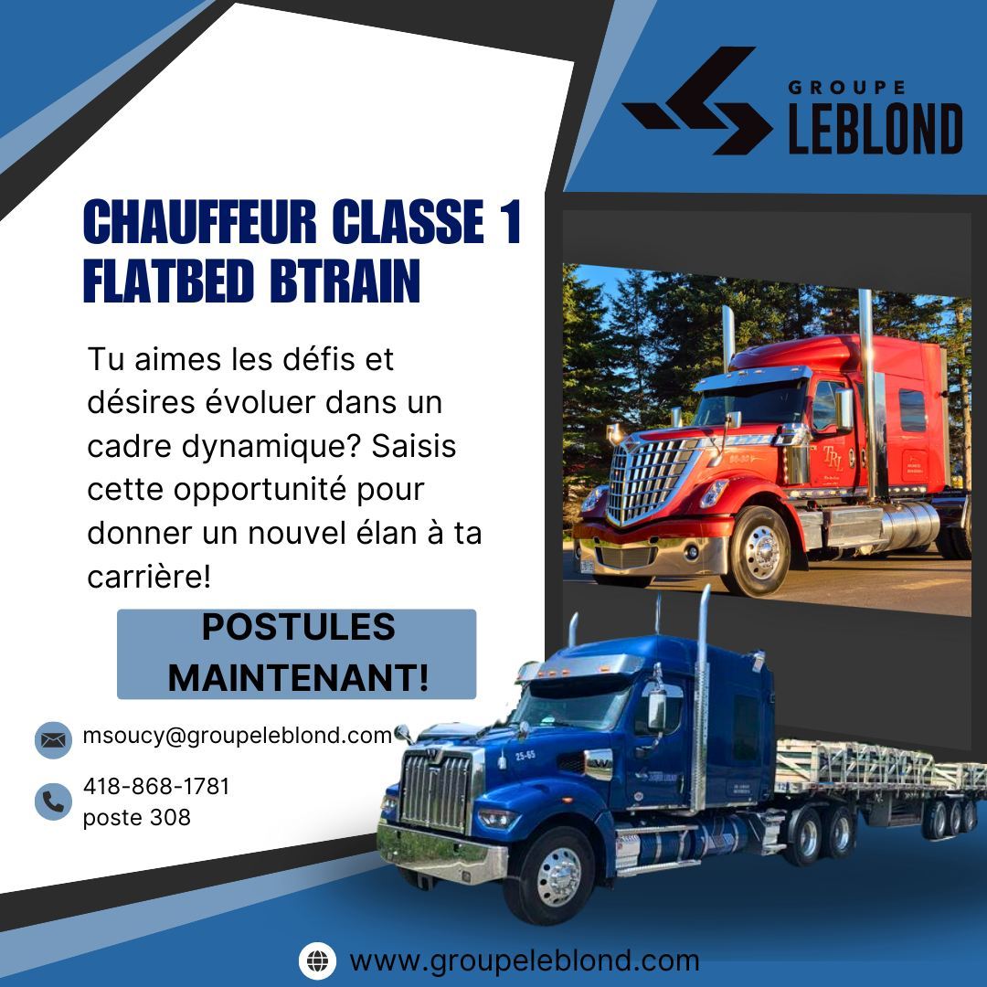 Nous sommes heureux de vous annoncer l’ouverture d'un poste pour un(e) 𝐜𝐡𝐚𝐮𝐟𝐟𝐞𝐮𝐫(𝐬𝐞) 𝐜𝐥𝐚𝐬𝐬𝐞 𝟏 en transport 𝐟𝐥𝐚𝐭𝐛𝐞𝐝 𝐁𝐓𝐫𝐚𝐢𝐧!