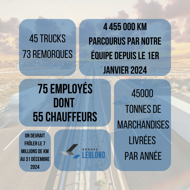 Nous sommes heureux et pas peu fiers, de partager quelques chiffres clés de notre entreprise. Actuellement, notre flotte se compose de 45 camions et 75 remorques. Depuis le début de l'année, nous avons parcouru près de 4,5 millions de kilomètres et nous prévoyons d’atteindre 7 millions de kilomètres d'ici la fin de 2024.